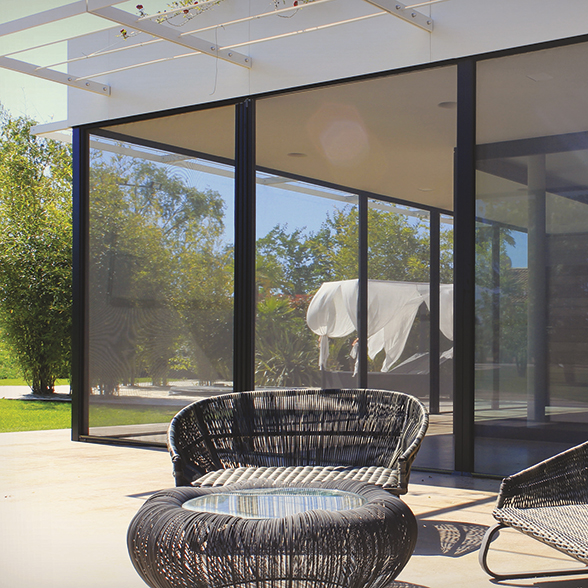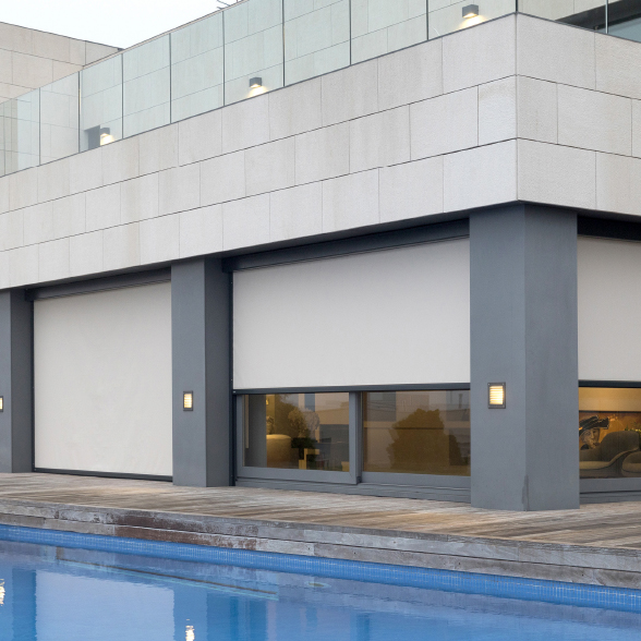 Esta gama de sistemas para exterior está formada por cortinas funcionales y robustas que resguardan el tejido de la erosión y de las inclemencias climáticas en un cajón que funciona como cortinero y embellece el conjunto.