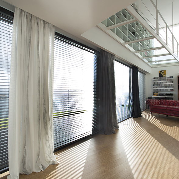 Los múltiples acabados que ofrece el sistema de veneciana Bandalux permiten elegir entre distintos componentes, colores y opciones para que la cortina haga juego con el estilo de tu casa.